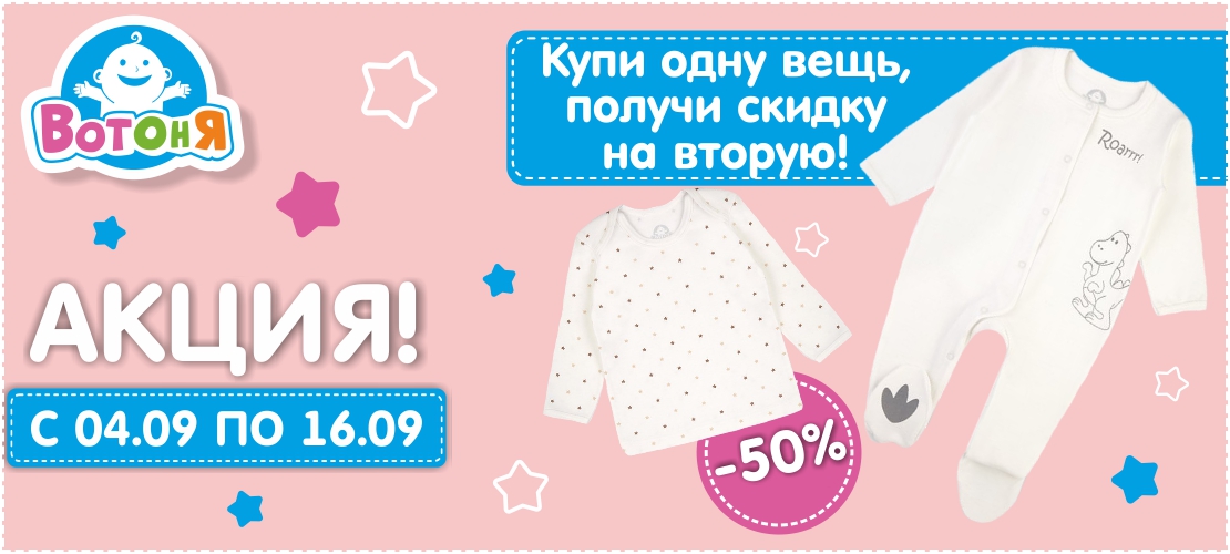 В период с 04 сентября по 16 сентября 2019 г. при покупке двух вещей торговой марки "ВОТОНЯ" - вторая вещь по наименьшей цене со скидкой 50%.