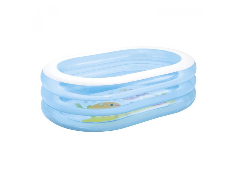 Бассейн надувной Intex, овальный, голубой создан для детей от 3 лет. Довольно просто оформлен, стенки бассейна прозрачные, что обязательно заинтересует ребенка. Оснащен клапаном слива. Борта состоят из трех колец, надуваются каждый отдельно. Дно бассейна украшено изображением обитателей моря.