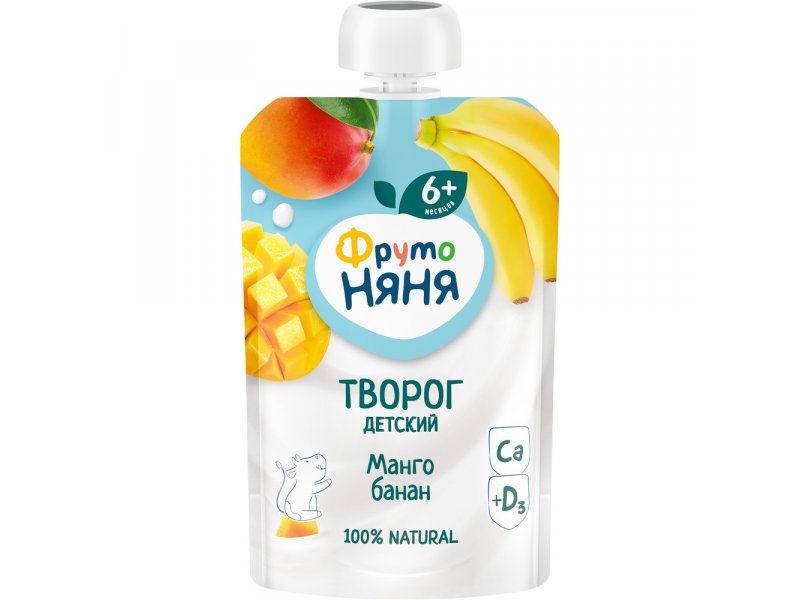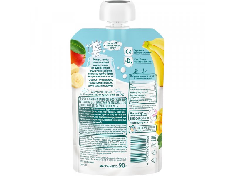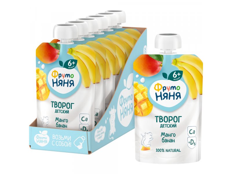 Биотворог ФрутоНяня с манго, бананом 4,2% предназначен для детей с 6 месяцев. Биотворог ФрутоНяня в мягкой упаковке – удобный формат незаменимого продукта в рационе малыша: биотворог теперь можно есть самостоятельно, без ложки, при этом не пачкаясь. Биотворог ФрутоНяня — это настоящий детский кисломолочный продукт, в котором сохранены ценные сывороточные белки, способствующие легкому усвоению продукта в желудочно-кишечном тракте, дополнительно обогащенный полезными бифидобактериями пробиотического штамма ВВ-12™, которые положительно влияют на пищеварение и здоровье малыша. Кальций, содержащийся в продукте, способствует укреплению костной системы. В состав фруктовых и ягодных творожков «ФрутоНяня» входят только натуральные фруктовые и ягодные пюре, позволяющие разнообразить ежедневный рацион ребенка и познакомить его с новыми вкусами. BB-12™ и CHR. HANSEN BB-12® принадлежат Chr.Hansen A/S.