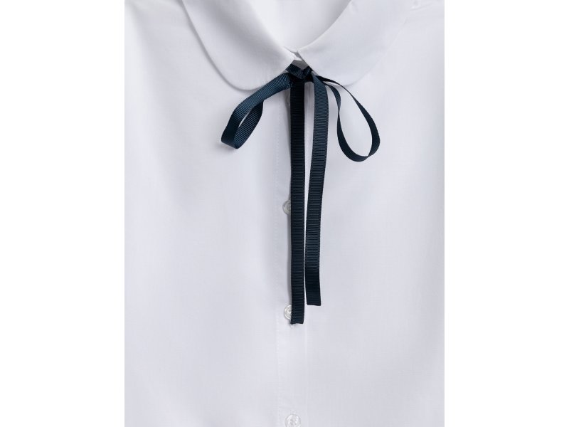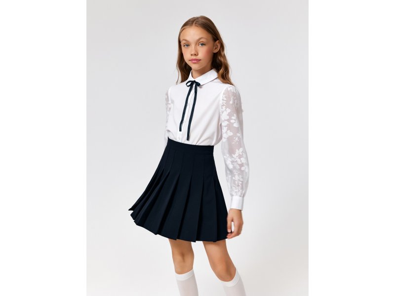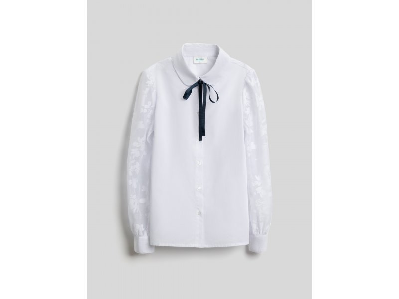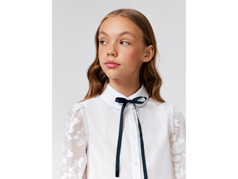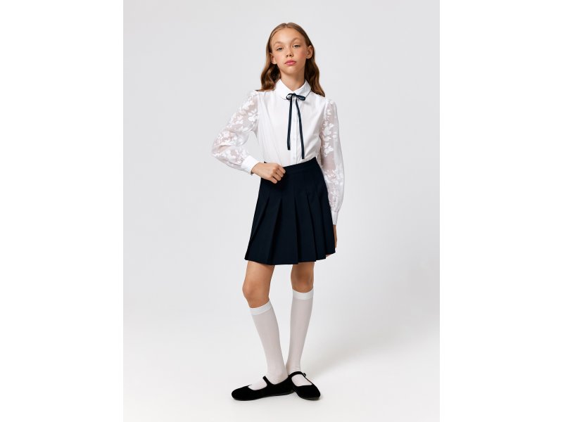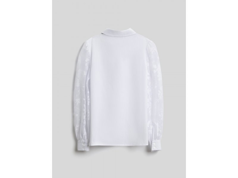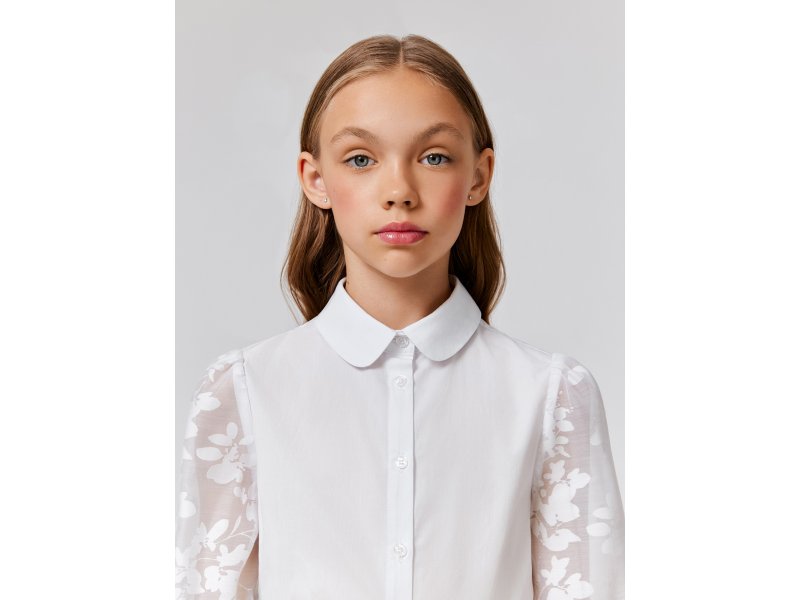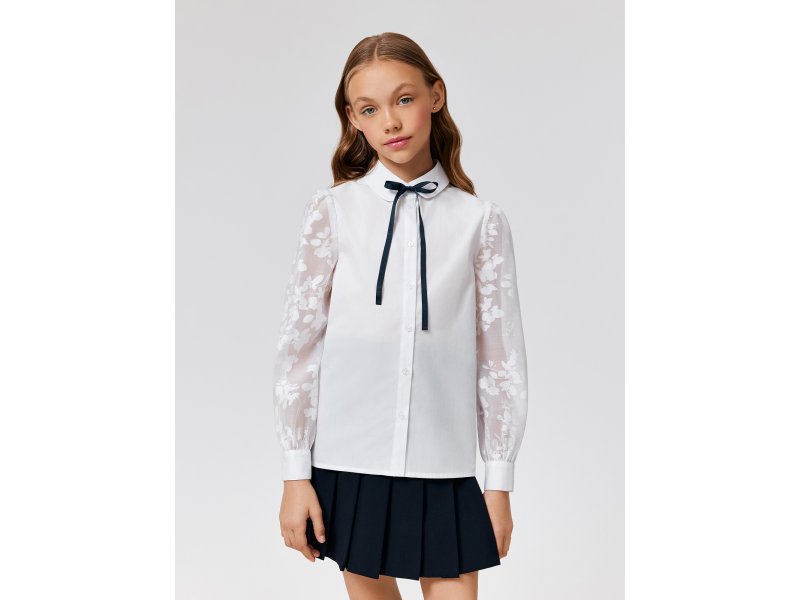 Детская белая блузка выполнена из хлопковой ткани и нежного кружева, обеспечивающих комфортное ношение на протяжении всего дня. Блузка прямого силуэта со стандартной линией плеч комфортно садится на разные типы фигур. Длинные рукава, выполненные из декоративной кружевной ткани, присборены к низу и собраны на манжеты с пуговицами. Изящный узор рукавов с цветочными мотивами придает блузке нежного шарма.