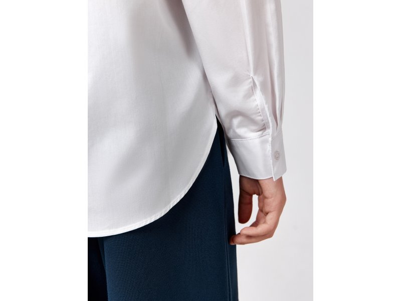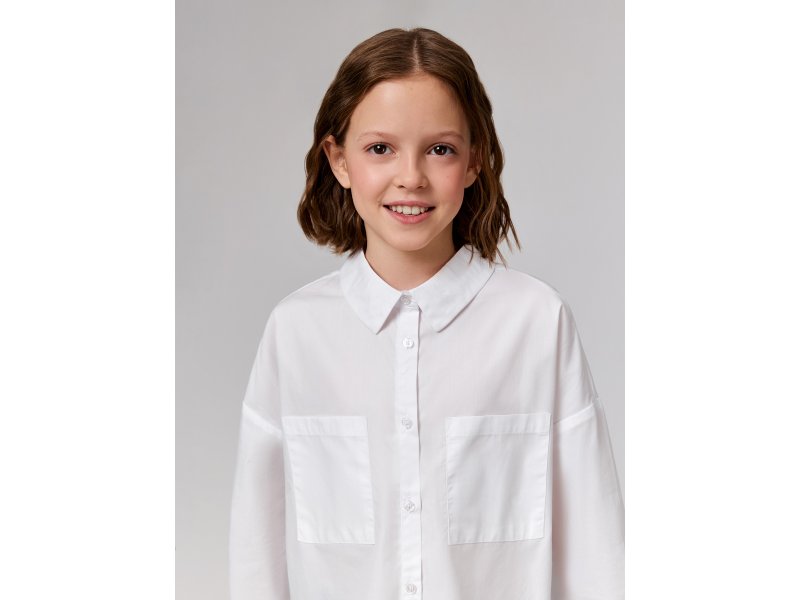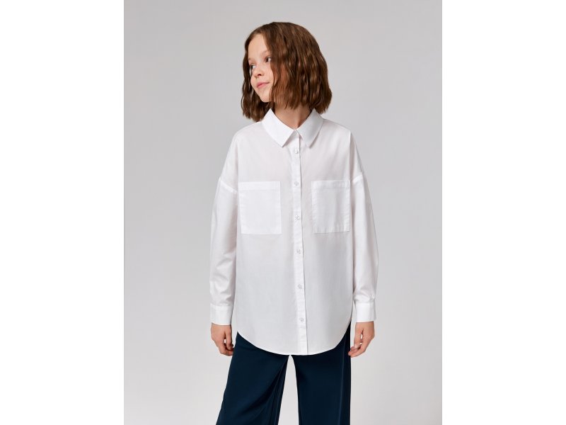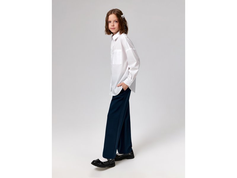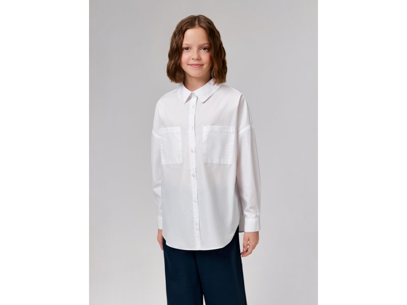 Детская блузка с рюшами для девочки выполнена из качественной и дышащей хлопковой ткани, которая обеспечивает комфортное ношение на протяжении всего дня. Рубашка прямого силуэта со стандартной линией плеч обеспечивает классическую посадку по фигуре, отвечающую строгим требованиям делового дресс-кода. По переду и спинке проходят рельефные швы, в которых вставлены декоративные рюши, придающие изящной легкости образу. Спереди расположена центральная застежка на пуговицы. Рубашечный воротник придает модели завершенный вид. Блузка с длинными рукавами, дополненными манжетами, является всесезонной моделью.
