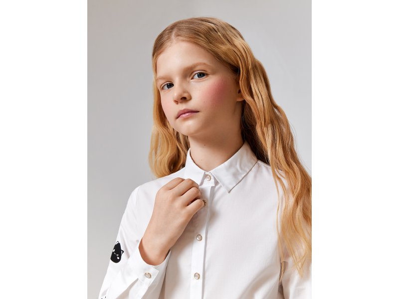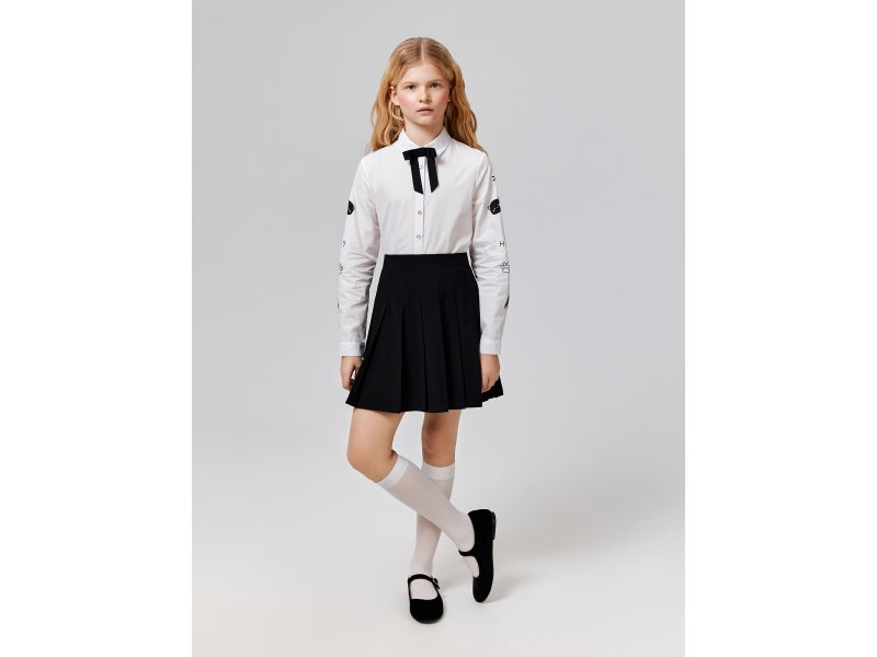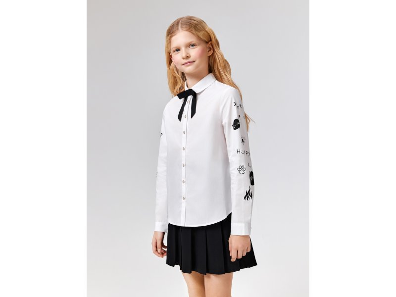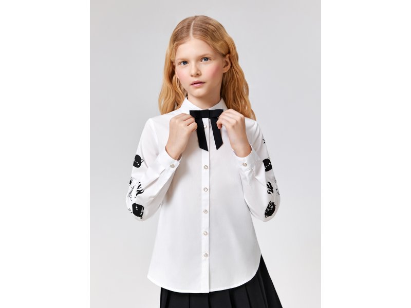 Детская белая блузка выполнена из хлопковой ткани и нежного кружева, обеспечивающих комфортное ношение на протяжении всего дня. Блузка прямого силуэта со стандартной линией плеч комфортно садится на разные типы фигур. Длинные рукава, выполненные из декоративной кружевной ткани, присборены к низу и собраны на манжеты с пуговицами. Изящный узор рукавов с цветочными мотивами придает блузке нежного шарма.