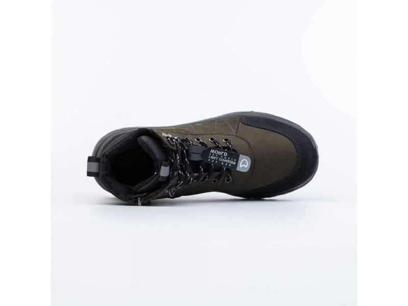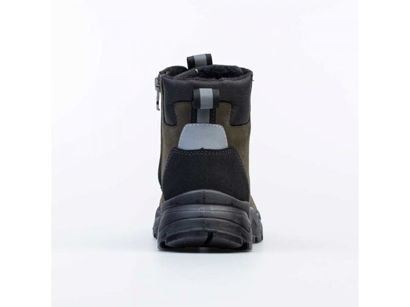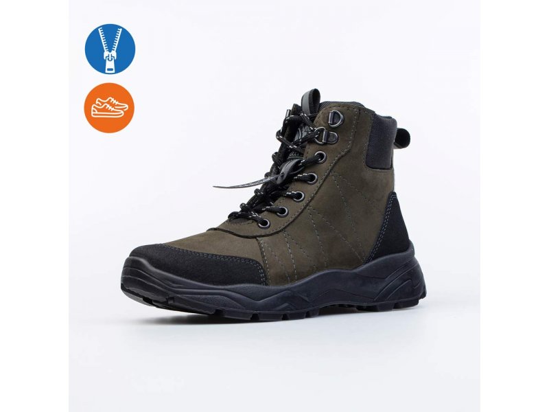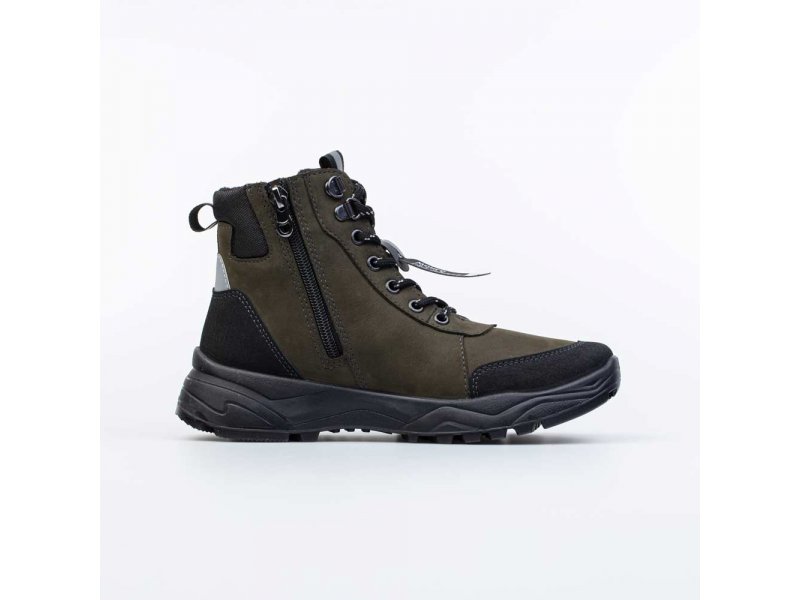 Ботинки в спортивном стиле имеют байковый утеплитель и предназначены для осенней и весенней погоды. Верх выполнен из натурального нубука цвета хаки. Классический язычок и манжет из текстиля обеспечивают отведение влаги во время активного движения. Подкладка из байки (больше 80% натуральная овечья шерсть) и съемная войлочная стелька хорошо сохраняют тепло. Молния обеспечивает максимальную раскрываемость модели при обувании, а шнуровка позволяет подогнать обувь по ноге и надежно её зафиксировать. Пяточная и носочная части защищены натуральной кожей с полиуретановым покрытием. Внутри защита пятки от трения - кожаная накладка поверх утеплителя. Подошва из ПУ легкая и отлично подходит для долгих прогулок. Модель анатомически правильная: пяточная часть имеет приподнятость по отношению к носочной, что создает оптимальную поддержку. Сделано в России.