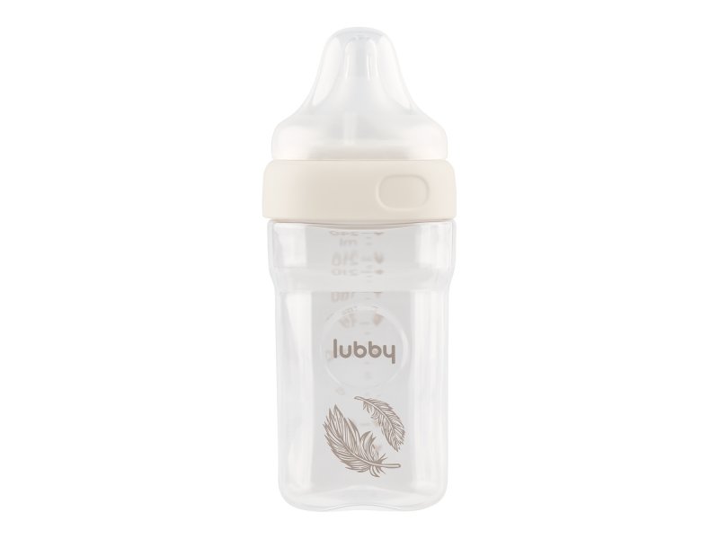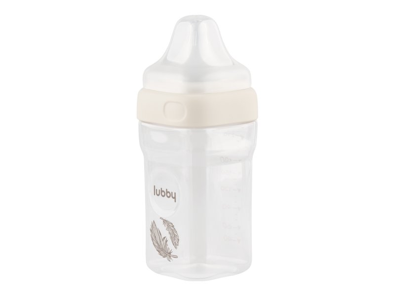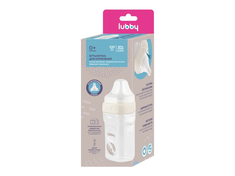 Бутылочка для кормления с широким горлышком оснащена силиконовой молочной соской медленного потока. Выполнена из безопасного материала - полипропилена. Такие бутылочки легкие, не бьются. Широкое горлышко позволяет удобнее засыпать смесь и такие бутылочки легче мыть. Силиконовые соски упругие, что способствует развитию жевательного аппарата, не вызывают аллергию. Мерная шкала имеет удобный шаг в 30 мл. К бутылочке подходят все молочные соски lubby для бутылочек с широким горлышком.