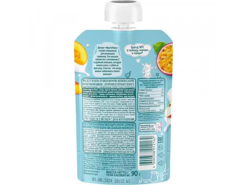 Десерт ФрутоНяня из молока и фруктов Яблоко, персик, маракуйя с сахаром 90 г