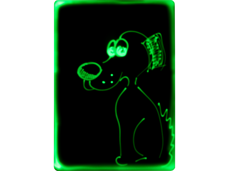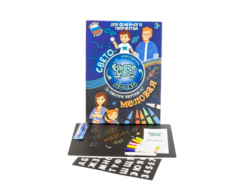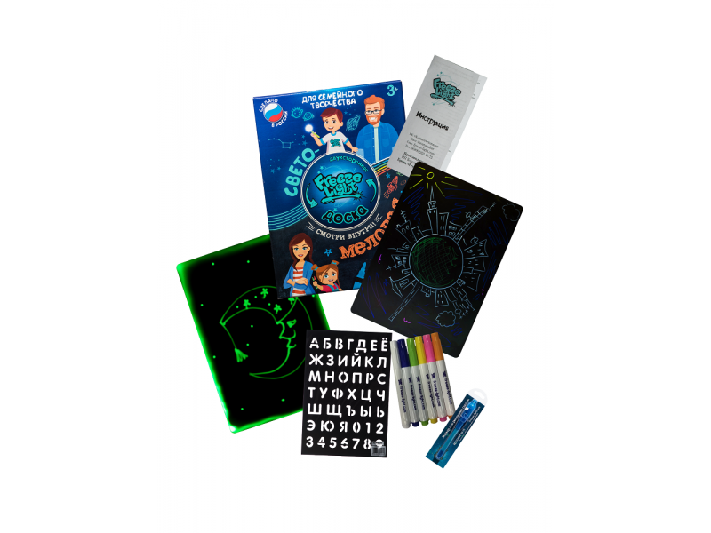 В комплекте: свето-меловая доска формата А3 толщиной 5 мм, маркер-фонарик, 6 шт меловых маркеров, трафарет «Буквы и цифры».