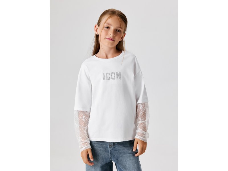 Детский лонгслив с двойным рукавом для девочки – это стильная модель для создания повседневных образов. Изделие выполнено из трикотажного полотна, котороеобеспечивает комфортное ношение.Двойные рукава выполнены из трикотажа и сетки, что придает аутфиту стильный акцент. Рукава из сетки декорированы принтом-флоком в виде бантиков, которые добавляют лонгсливу очаровательный штрих. Модель с посадкой comfort отличается свободным кроем, что дарит большую свободу движений. Округлая горловина не мешает при одевании.Изделие представлено в двух цветах: черном и белом. Комбинируйте лонгслив с джинсами, чтобы создать стильный образ для повседневного ношения.