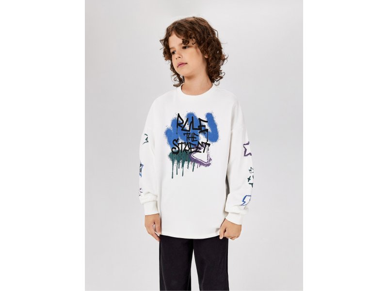 Детский свитшот с принтом в стиле граффити для мальчика — это стильная модель для создания оригинальных образов. Толстовка изготовлена из мягкого хлопкового футера с петлями на изнанке (без начеса), который обеспечивает комфортное ношение на протяжении всего дня. Свитшот оверсайз со спущенной линией плеча создает объемный модный силуэт и позволяет создавать сложные многослойные образы в холодное время года. Свободный крой дарит свободу и легкость движений, что особенно важно для активных детей, танцоров и спортсменов. Белый свитшот дополнен ярким принтом в стиле граффити. Удобная округлая горловина, низ изделия и рукавов выполнен в виде эластичных манжет для лучшего прилегания к телу и сохранения формы. Стилизуйте модель в повседневном образе с любимыми джинсами или брюками-джоггерами. Состав: хлопок 100%. Уход за изделием: Не отбеливать; Деликатная стирка в теплой воде до 40C; Не использовать химчистку; Не использовать машинную сушку; Гладить при температуре не более 150C; Стирать с изделиями схожих цветов; Не замачивать; Вывернуть на изнаночную сторону перед стиркой