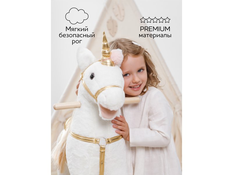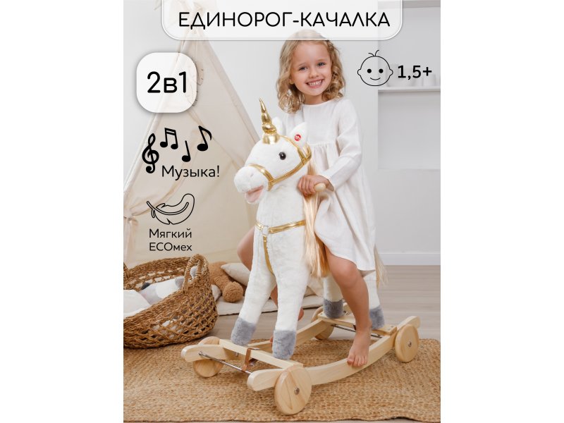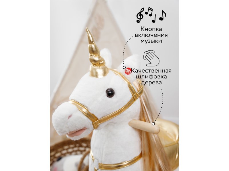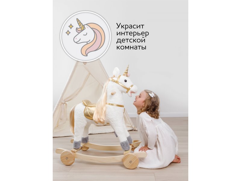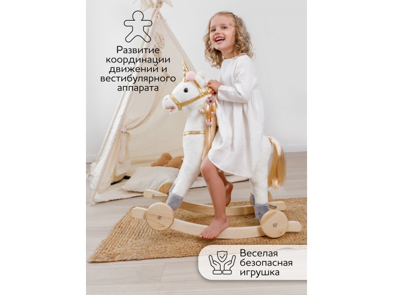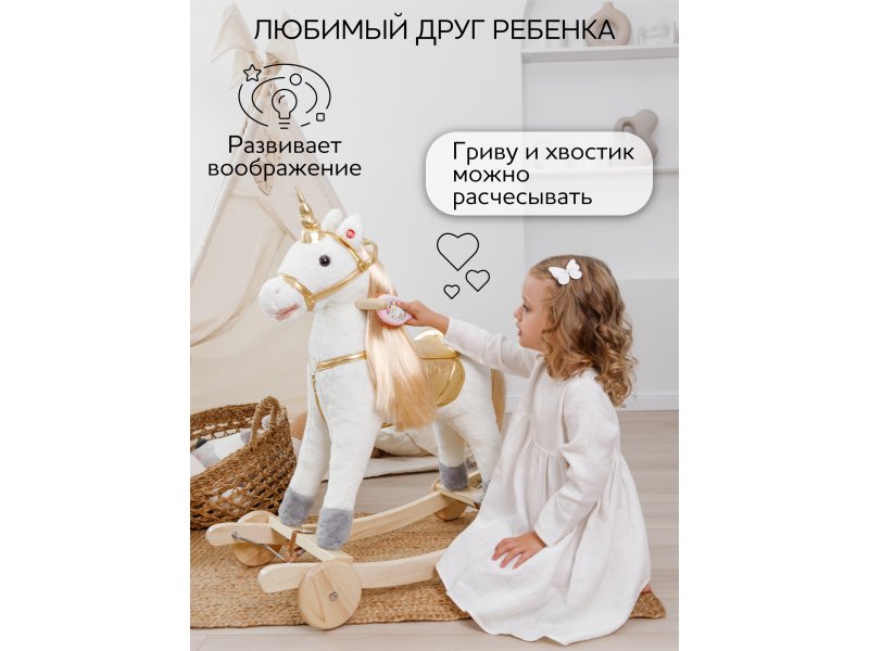 Шерстку и гриву можно расчесывать, заплетать, позволяя ребенку проявлять воображение. Мех легко можно очистить щеткой. Ребенок с удовольствием сможет самостоятельно ухаживать за своим новым другом. Музыкальная детская качалка поет песню при нажатии на ушко, а также умеет открывать рот.
