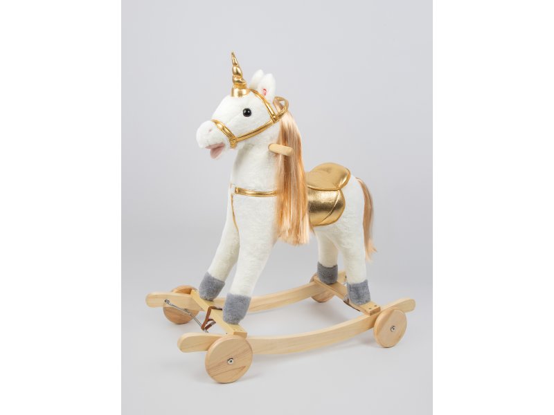 Единорог может использоваться как качалка, так и как каталка - достаточно перекинуть колеса под деревянные полозья.
