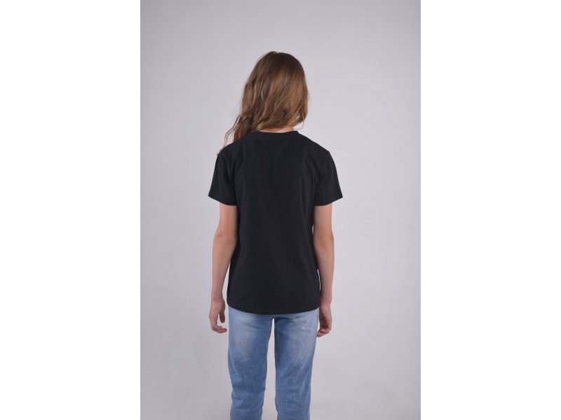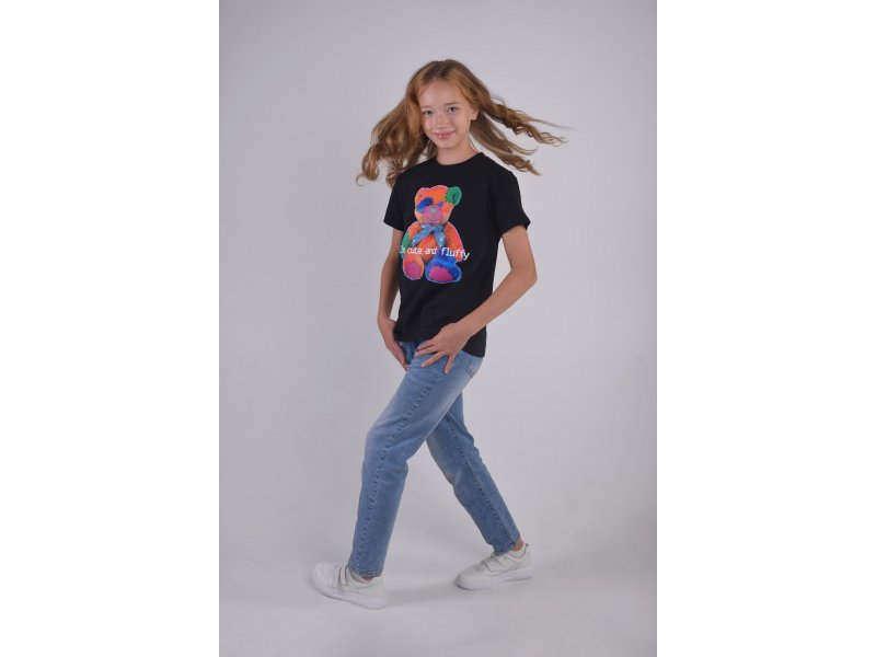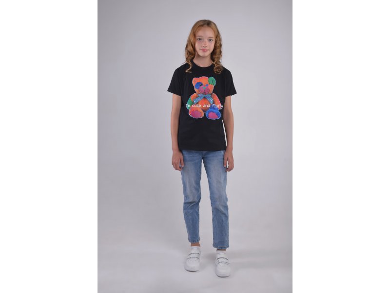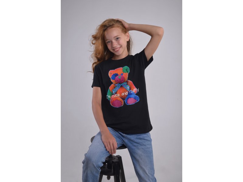 Стильная футболка для девочки свободного кроя и классической длины из качественного мягкого на ощупь хлопкового полотна 170 г/м2 с puff print (паф принт) - технология, позволяющая наносить рельефный рисунок на поверхность ткани, сохраняет свое качество после стирки и растяжения. Крупный объемный принт черного цвета поможет создать модный образ, станет незаменимой частью гардероба самой стильной современной девчонки.