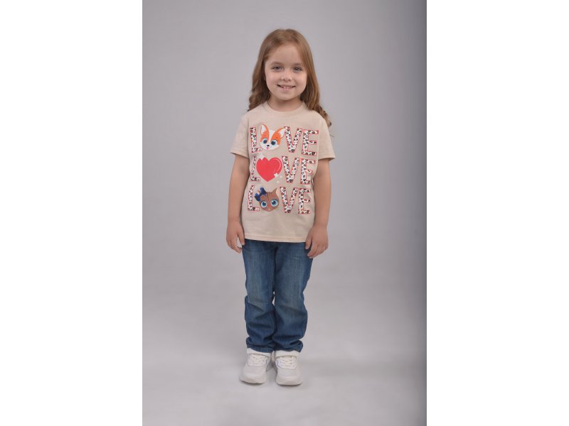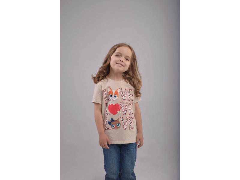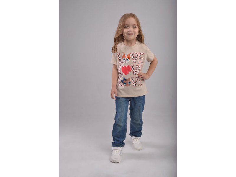 Модная футболка свободного кроя и классической длины из качественного мягкого на ощупь хлопкового темно-серого меланжевого полотна 170 г/м2 с transfer print (трансфер принт) - технологией нанесения картинки на изделие с использованием высоких температур. Стильный принт веселых мордашек животных с актуальным эффектом потертости, "трещинок", гладкий, не плотный, с хорошей износостойкостью рисунка после стирки и растяжения. Идеальная модель для стильной и активной маленькой девочки.