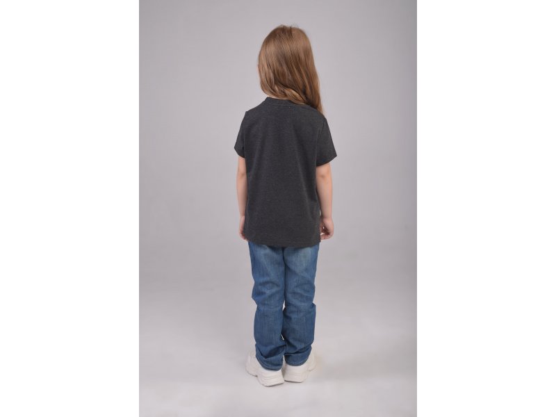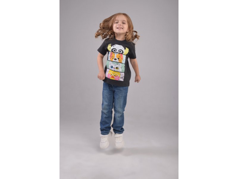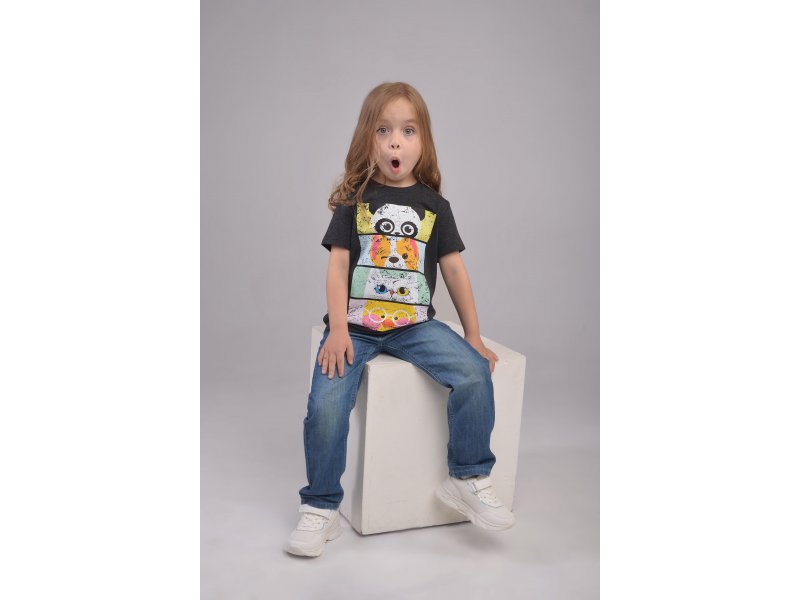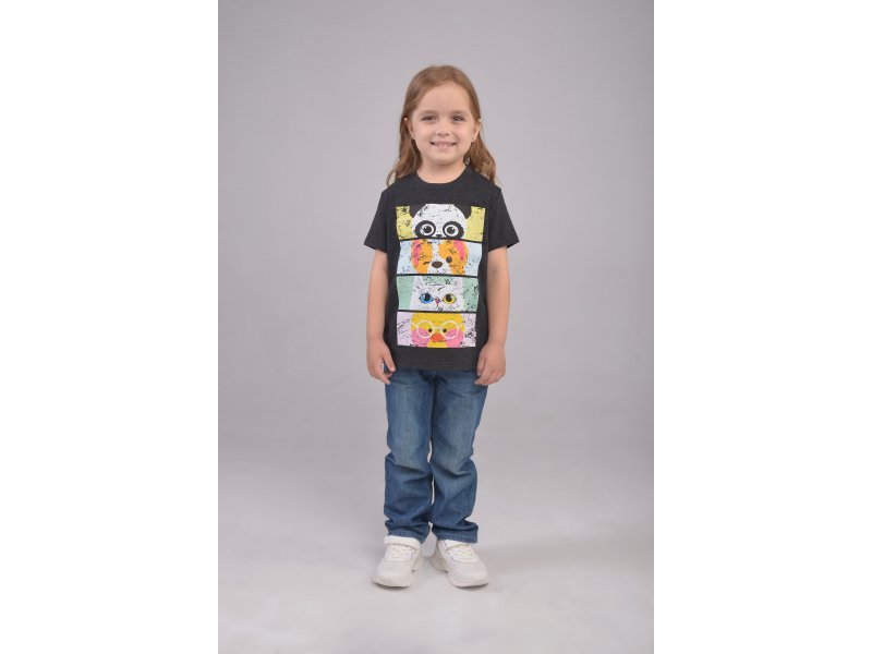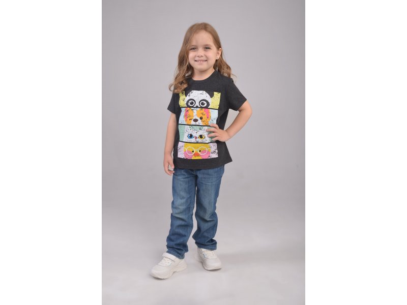 Модная футболка свободного кроя и классической длины из качественного мягкого на ощупь хлопкового темно-серого меланжевого полотна 170 г/м2 с transfer print (трансфер принт) - технологией нанесения картинки на изделие с использованием высоких температур. Стильный принт веселых мордашек животных с актуальным эффектом потертости, "трещинок", гладкий, не плотный, с хорошей износостойкостью рисунка после стирки и растяжения. Идеальная модель для стильной и активной маленькой девочки.