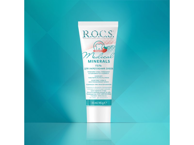 Гель Rocs Медикал для укрепления зубов Minerals Фрут. Является источником биодоступных соединений кальция, фосфора и магния, укрепляющих эмаль. Уникальный гель является источником легкоусвояемых соединений кальция, фосфора и магния.