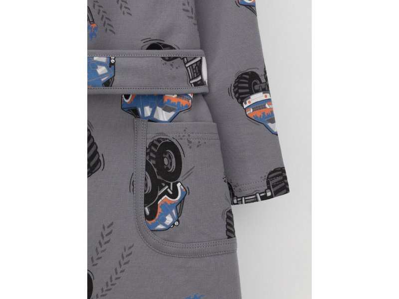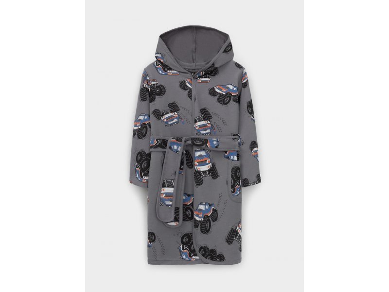 Халат с тонким капюшоном. Изготовлен из набивного хлопкового трикотажа футер петля.