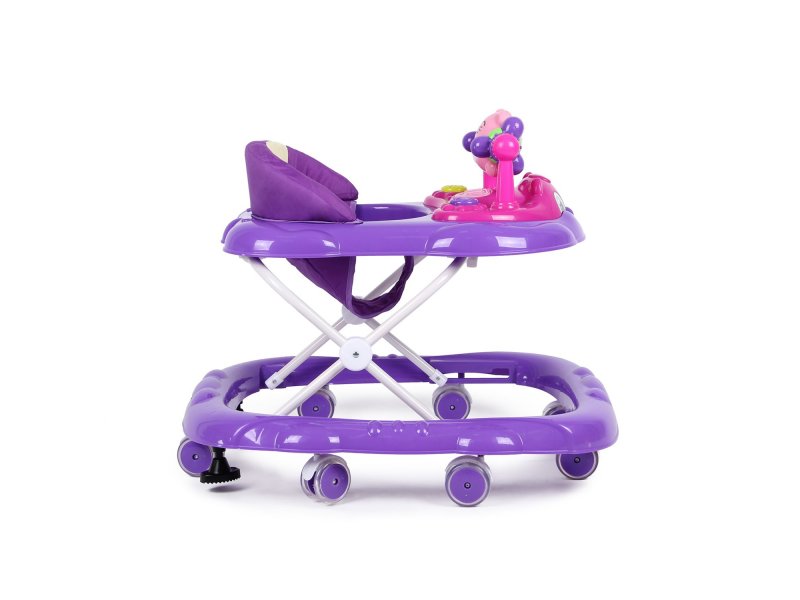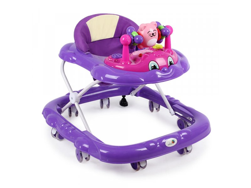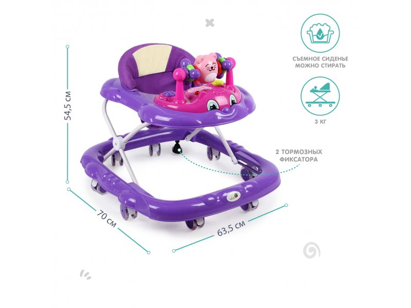 Колеса, размещенные по периметру базы, обеспечат плавный ход. Возможность поставить колеса на тормоз поможет маме приглядеть за малышом и не переживать, что он «укатится» без ее ведома. На ходунках имеются световые и музыкальные элементы, которые развлекут кроху. Несколько уровней по высоте позволят подобрать соответствующий комплекции ребенка.