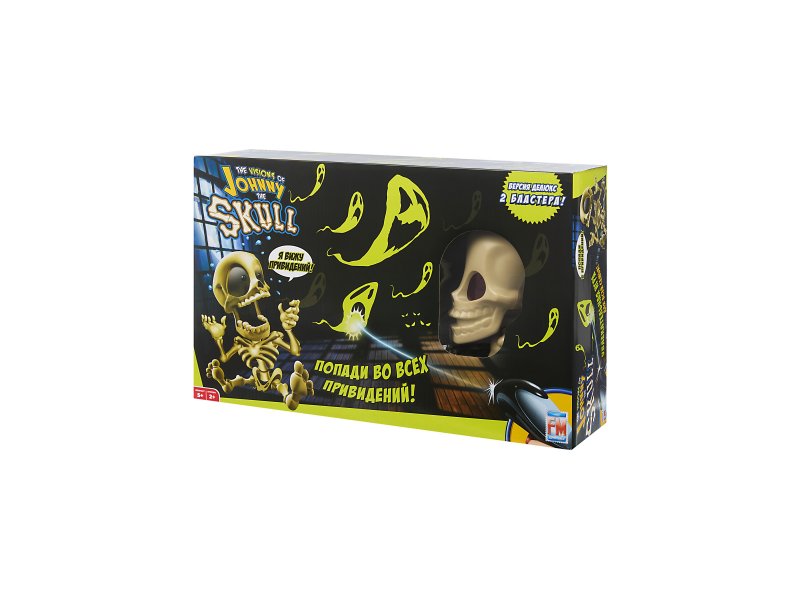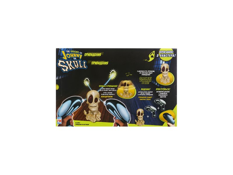 Интерактивный игровой набор (прототип лазергата). В комплекте есть: 1 фигурка в виде скелета, 2 бластера, 2 аксессуара (2 ступни, которые необходимо закрепить по бокам на фигурке-скелете, чтобы она стала наиболее реалистичной), 1 инструкция на русском языке. Перед началом игры следует установить батарейки в фигурку-скелет и бластеры согласно инструкции (в комплект не входят). Далее необходимо переключить тублер на боковой части скелета в положение "ON", сопрячь бластеры с фигуркой путём поочерёдного нажатия на спусковые крючки каждого из них, выбрать один из предложенных уровней сложности на передней части фигурки (на выбор есть 3 уровня сложности. Они отличаются скоростью смены проекций приведений). После проделанных действий голова черепа включится и начнёт хаотично двигаться вверх-вниз-влево-вправо под разными углами и проецировать из одного глаза фигурки приведений. Рекомендуется поместить игру на пол или стол в тёмной комнате для того, чтобы проекции приведений было лучше видно. Суть игры: используя бластеры целиться и стрелять в приведения. В конце каждого раунда бластеры называют количество попаданий и рекорд (если играете не в первый раз). Каждый выстрел сопровождается определённым звуком, каждое попадание в приведение сопровождается другим, особым звуком. Поскольку в комплекте 2 бластера, играть рекомендуется вдвоём