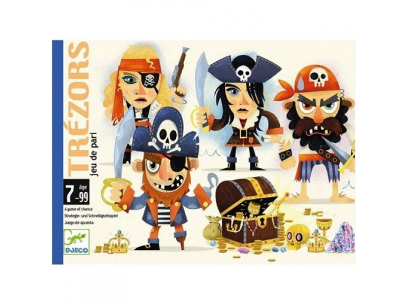 Карточная игра Сокровища от Djeco - веселая и динамичная тактическая игра со ставками, которая поможет детям весело провести свободное время. Каждый игрок получает одинаковый набор карточек для ставок. Каждая карточка соответствует одному из шести видов сокровищ игры. Чем реже сокровище (чем его меньше в игре), тем больше оно дает очков. На стол выкладывают 3 карточки: две карточки — лицевой стороной вниз, а третью — лицевой стороной вверх. Игроки ходят одновременно, делая ставку на сокровище, которое, как они надеются, выпадет при открытии карточек на столе. Затем они открывают 2 закрытые карточки: если игрок сделал ставку на выпавшее сокровище, он забирает его. Если 2 игрока сделали ставку на одно и то же выпавшее сокровище, его зарабатывает тот, кто первым ударит по нему. Когда карточки с сокровищами заканчиваются, выигрывает тот, кто заработал больше всех очков.