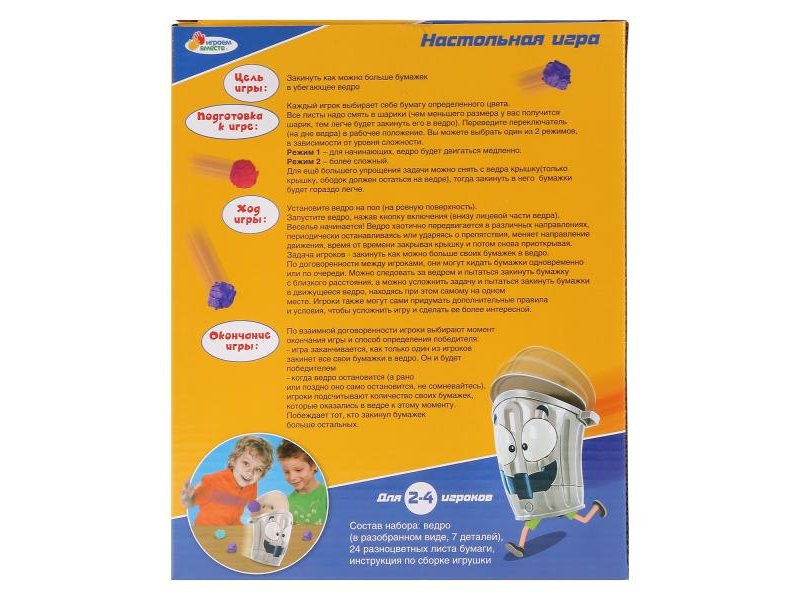 Веселую и увлекательную настольную игру Играем вместе Чокнутое ведро по достоинству оценит любой ребенок. Задача игроков проявить всю свою ловкость и сноровку, чтобы забросить в ведро скомканную бумажку. Сделать это нелегко, ведь ведро всё время пытается убежать. Убегающее ведро изготовлено из качественной, прочной пластмассы.