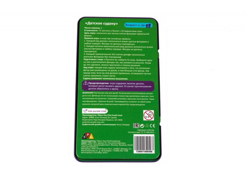 Игра настольная The Purple Cow Детское судоку, магнитная. Настольная игра для путешествий Детское судоку - это увлекательная игра, развивающая логическое мышление. Основное отличие данного варианта от классической игры заключается в том, что в нем заменены числа на разноцветные фишки с картинками, правила же остаются прежними. Тем не менее игра будет интересна не только детям, но и новичкам-взрослым.