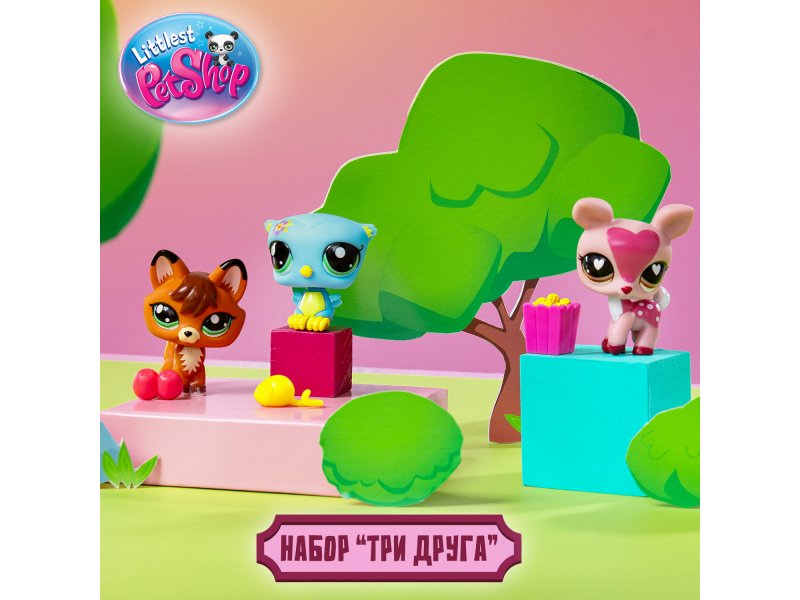 Новая коллекция 2025 от Littlest Pet Shop (лицензия Hasbro) предлагает набор "Три друга" – с тремя фигурками питомцев и аксессуарами.