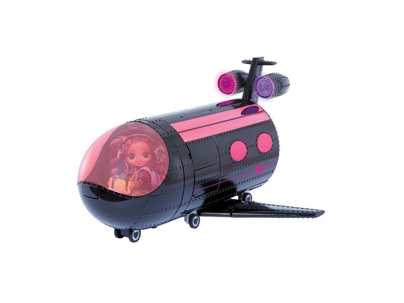 Черный стильный самолет-трансформер для полета в музыкальный тур куколок LOL Surprise Remix. Транспортное средство подходит для всех типов куколок. Быстро превращается в автомобиль, студию звукозаписи и микшерную будку. Части самолета можно выдвигать, переворачивать, раскрывать.