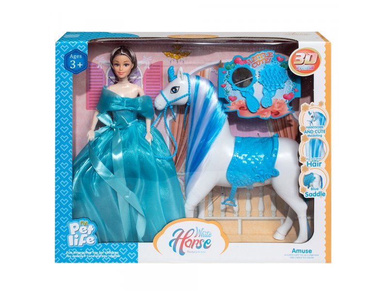 У куклы красивые длинные волосы, которые можно расчесывать расческой, входящей в состав набора, и создавать различные прически. Кукла одета в пышное платье принцессы. У лошади длинная мягкая грива, красивое седло и уздечка.