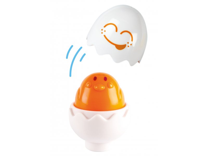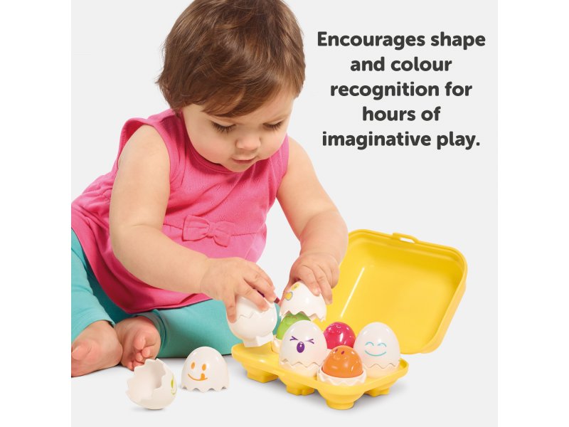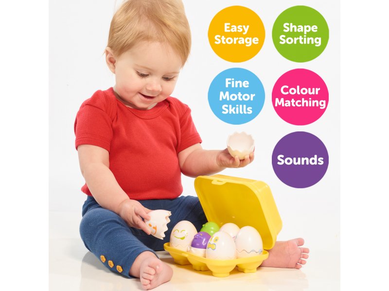 Малышам предстоит сопоставить половинки яиц и цыплят по цвету и найти каждому цыпленку правильное место, ориентируясь на форму в основании лотка. Некоторые цыплята весело пищат при нажатии, а другие - издают звуки, как погремушка, развивая слуховое восприятие ребенка.