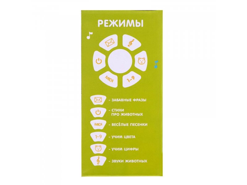 Режимы игры: Забавные фразы. Стихи про животных. Учим цвета. Учим цифры. Весёлые песенки. Звуки животных.