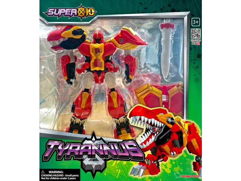 Робот трансформер Супер10 Тиранус. Один из главных героев одноимённого мультфильма Супер10. Тиранус - смелый и гордый, обладает огненной силой, может трансформироваться из робота воина в робота тираннозавра.