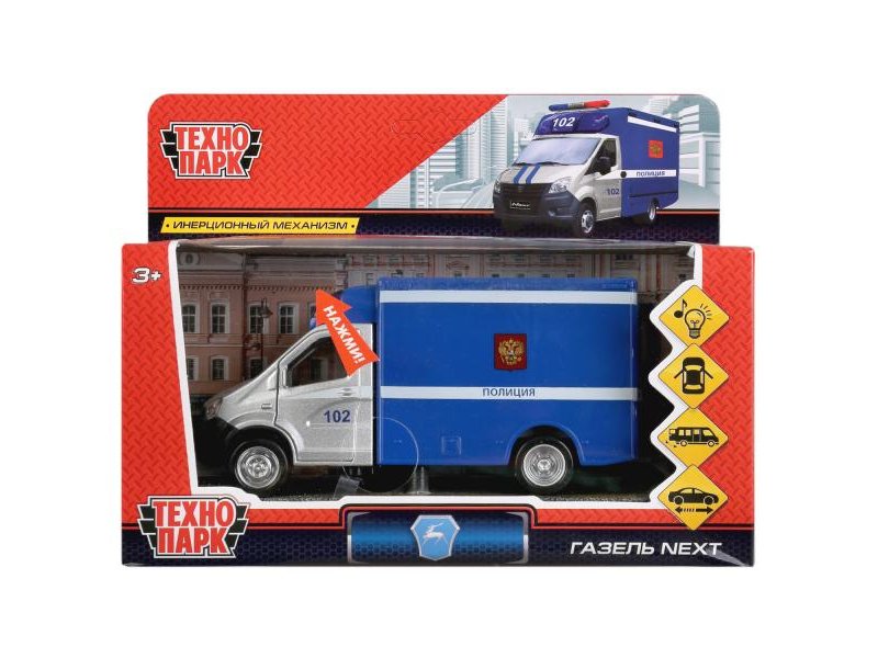 Развивающая игрушка Технопарк, Машина Газель Next Полиция».«ГАЗель NEXT ПОЛИЦИЯ» - это оригинальная коллекционная модель машины, выполненная в реалистичном дизайне. Благодаря инерционному механизму и подвижным деталям, играть с такой машиной ребёнку будет особенно интересно. Игра с такой оригинальной игрушкой-моделью тренирует моторику, развивает фантазию и воображение ребёнка, знакомит его с видами транспорта. Коллекционная металлическая модель «ГАЗель NEXT ПОЛИЦИЯ» 5 в 1: Точная копия настоящей машины; С подвижными деталями: дверь водителя и задние двери открываются; Со световыми эффектами; Со звуковым сопровождением; С инерционным механизмом (чуть надавите на модель и потяните на себя, и машинка автоматически устремится вперёд).