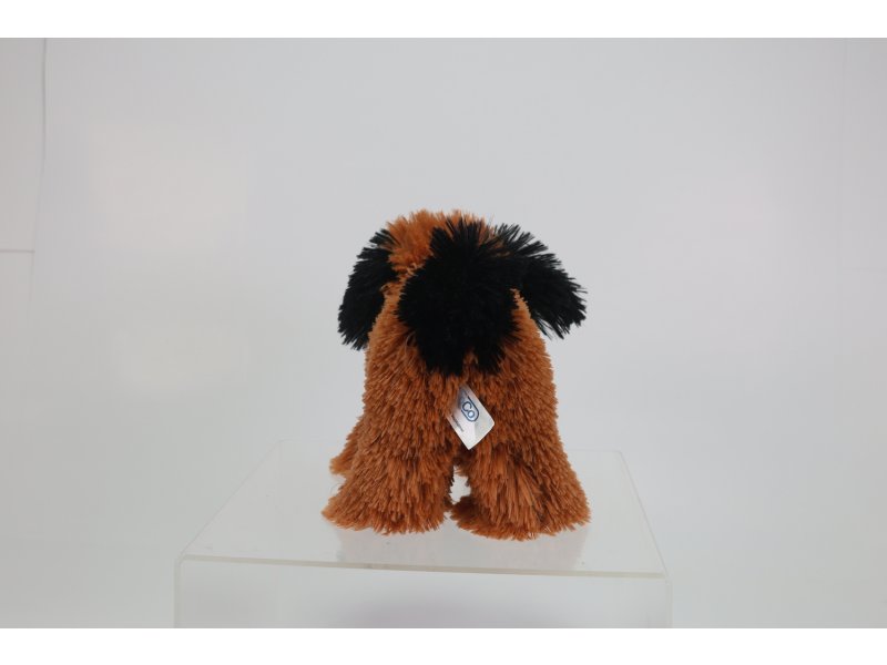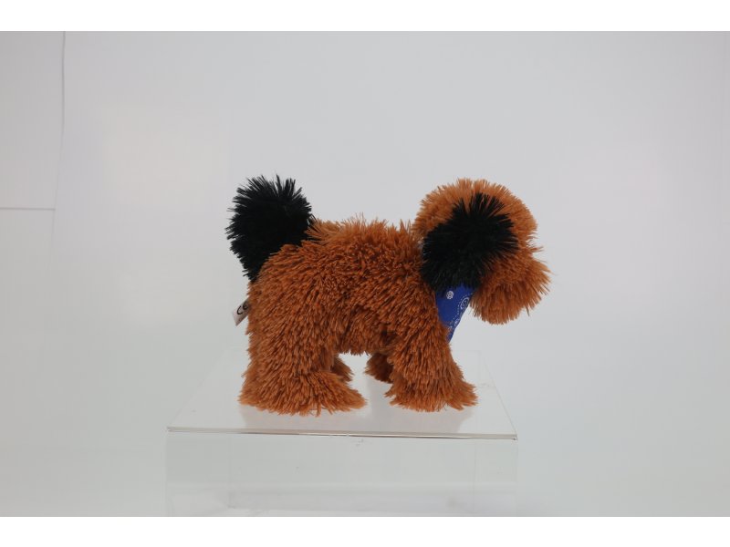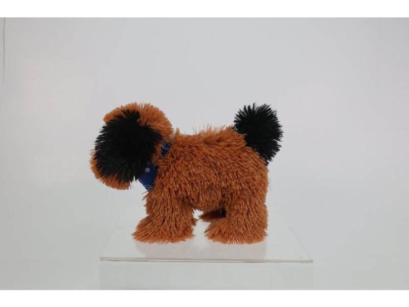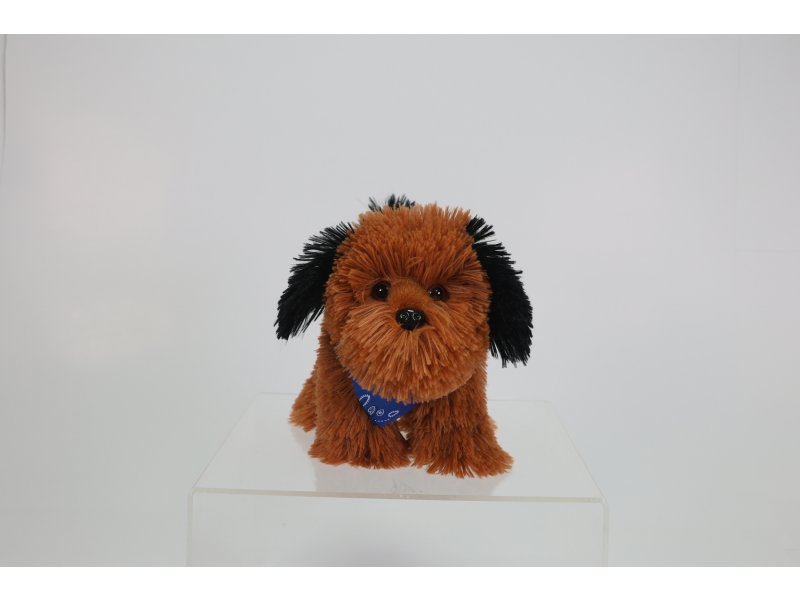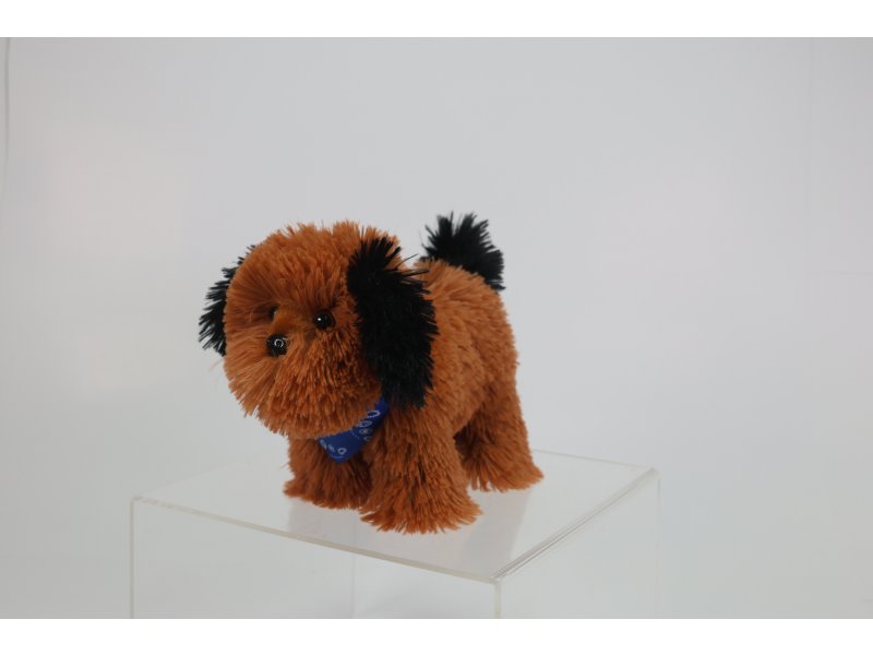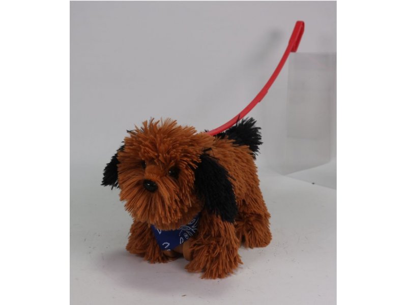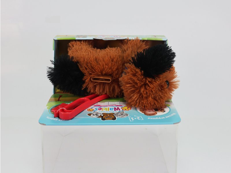 Игрушка собака коричневого цвета из плюша со съемным поводком (разбирается на два равных отрезка длиной 30 см) и тканевой банданой в комплекте. Имеет запатентованный пластиковый механизм, позволяющий ей ходить по любой твёрдой поверхности без батареек, если потянуть ее за поводок. Механизм состоит из двух колес, соединенных с передним лапами. При движении колеса крутятся, приводя в движение передние лапы; таким образом, создается ощущение, что собака ходит. Данный механизм съемный, что позволяет ребенку после прогулки его достать и использовать как классическую мягкую игрушку