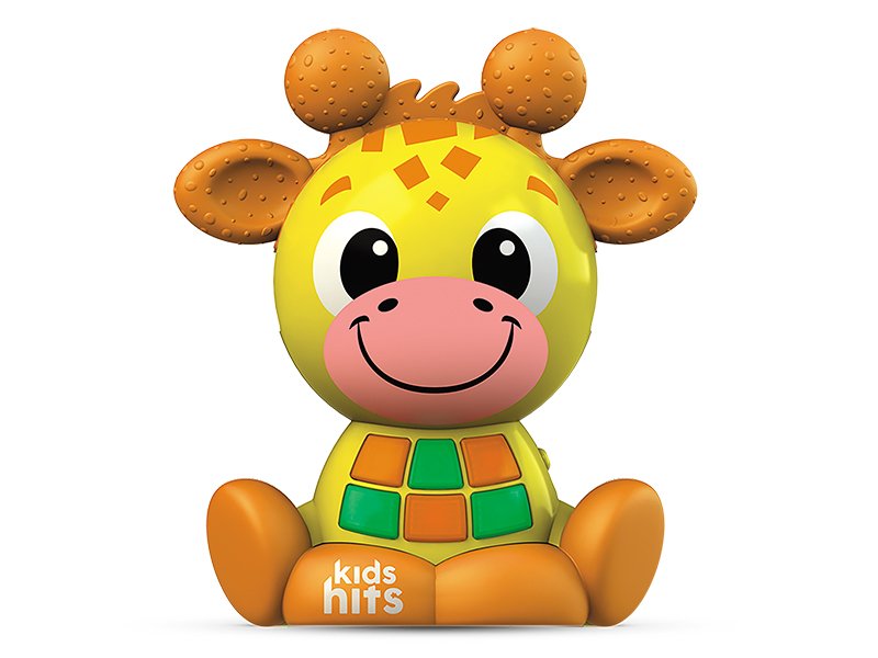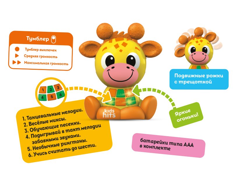 Пластиковая интерактивная игрушка в виде жирафа со светящимися кнопками, музыкой, различными текстурами, приятными на ощупь, и подвижным элементом.