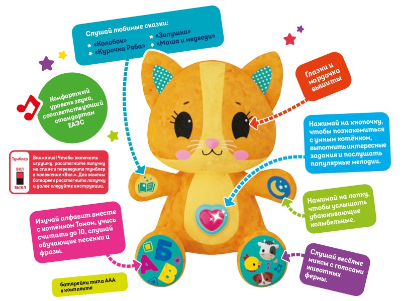 Плюшевая интерактивная игрушка-котенок со светящимся животиком и мягкими лапками, которые реагируют на прикосновения малыша и предлагают множество увлекательных занятий.