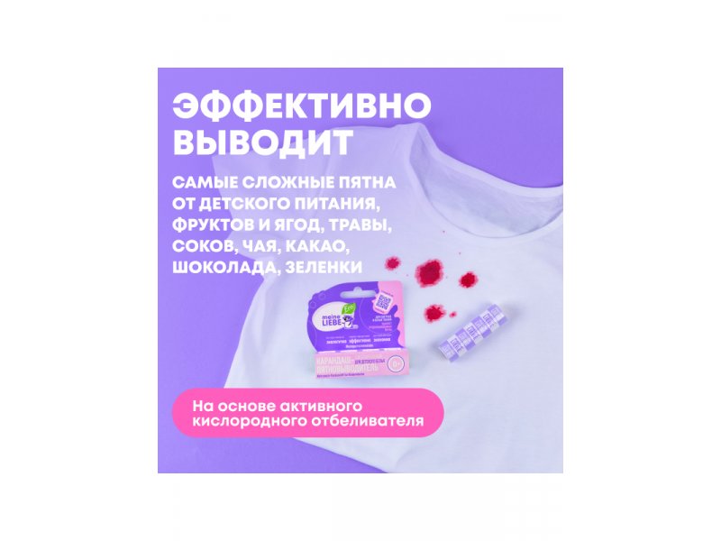 Безопасное средство для предварительного и деликатного выведения пятен с детского белья. Эффективно справится с характерными пятнами малышей и подросших деток: от детского питания, фруктов и ягод (вкл. детские пюре), соков, чая, какао, травы, ручки, красок, йода, зеленки, крови, специфических детских загрязнений. Естественный эффект пятновыведения осуществляется благодаря разрушению загрязнений на поверхности вещей пузырьками кислорода. Затем во время стирки частицы загрязнений без остатка смываются водой. Бережен к тканям, подходит для цветных и белых тканей. Компактный размер удобен для хранения и использования дома, в гостях и в поездках.