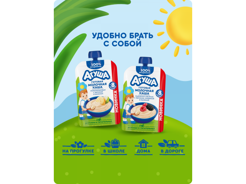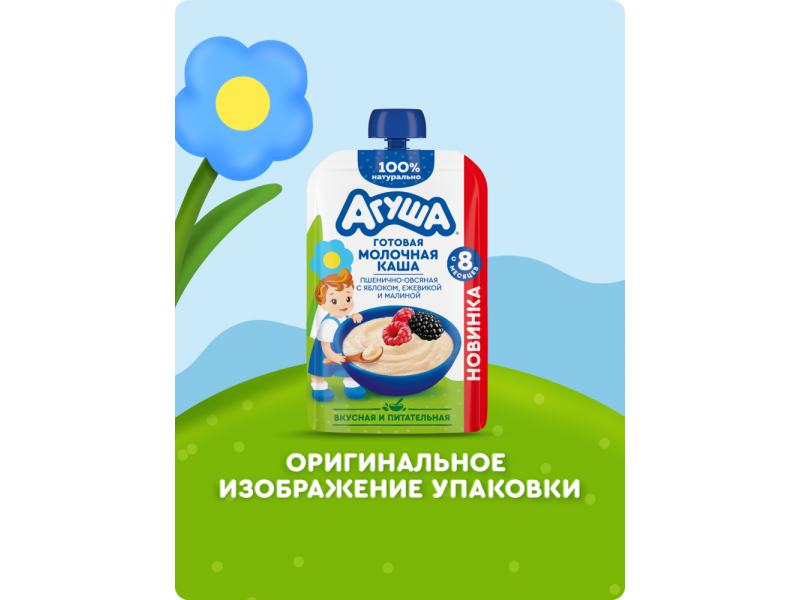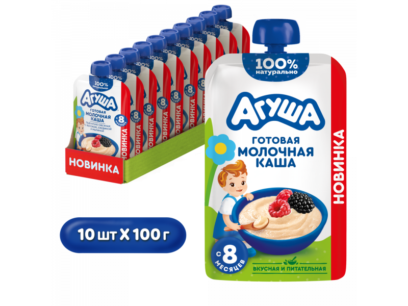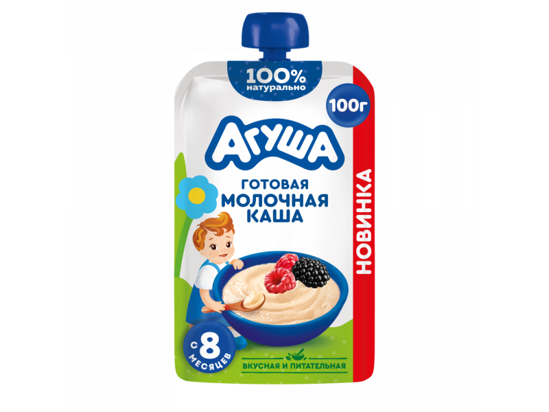 Новинка от Агуши для детей с 8 месяцев – детская готовая молочная каша без варки. Вкусная, питательная 100% натуральная пшенично-овсяная каша с овсяными хлопьями, яблоком, ежевикой, малиной и без добавления консервантов имеет высокое содержание молока и злаков. Технологический процесс имитирует приготовление каш в домашних условиях. Правильная густая консистенция позволяет легко есть из мягкой упаковки. Эту кашу «Агуша» удобно брать с собой.