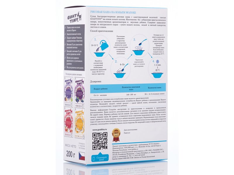Каша Goattiny рисовая на козьем молоке предназначена для детей с 4 месяцев. Каша производится в соответствии с высочайшими стандартами безопасности пищевых продуктов и с использованием только натуральных не содержащих ГМО ингредиентов.