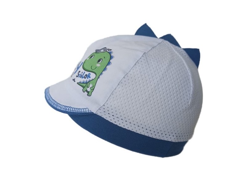 Кепи для мальчика, с мягким козырьком, из ажура (мягкого хлопкового трикотажного полотна со сквозным орнаментом в виде сеточки). Декорировано принтом и гребешком дракончика.