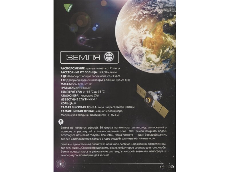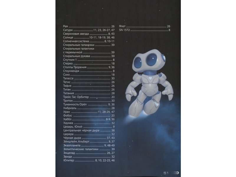 Энциклопедия "Космос" это: 62 интереснейших космических объекта (планеты, спутники, Столпы творения, черные дыры), объемные модели которых можно рассмотреть с помощью дополненной реальности; Бесплатное приложение DEVAR, которое работает на смартфонах и планшетах c iOS и Android; 238 интересных фактов о космосе; Функционал, позволяющий приближать, вращать и подробно рассматривать космические тела; Возможность легко запомнить даже сложные названия и определения космических тел, историю освоения космоса благодаря обучающим технологиям дополненной реальности; Персональный робот-помощник, который расскажет о космическом объекте, который ребенок изучает в дополненной реальности; Полиграфическое исполнение высочайшего качества: твердый переплет и плотная мелованная бумага.