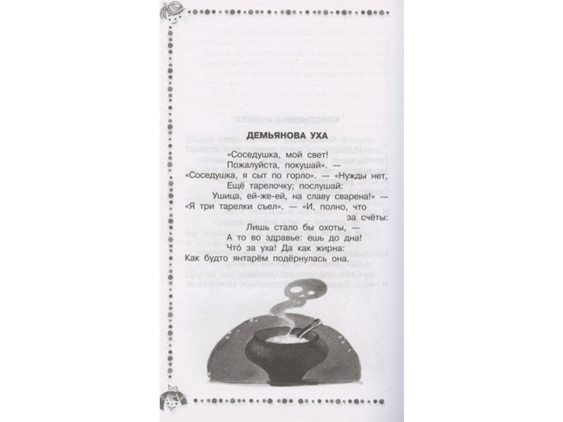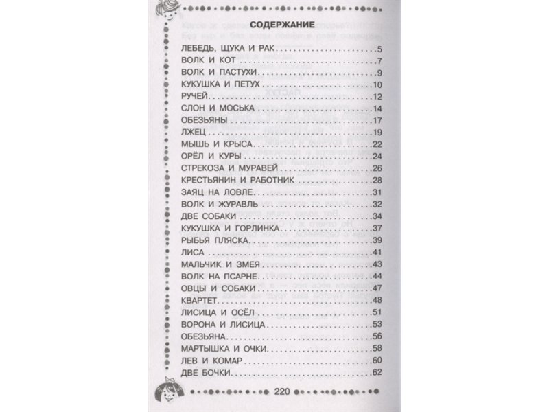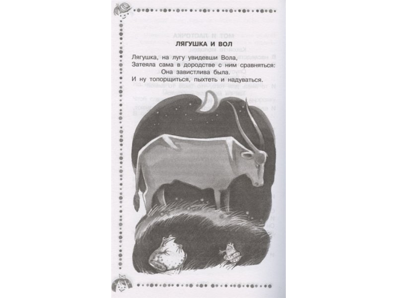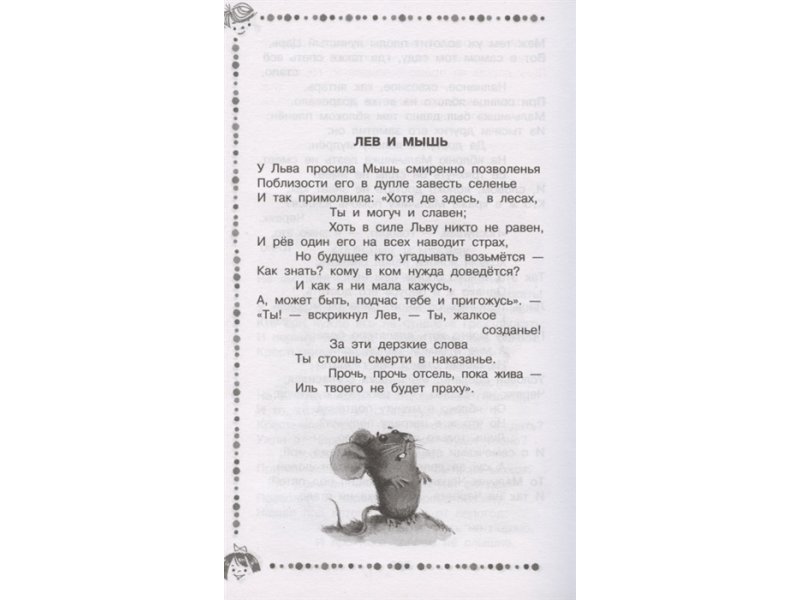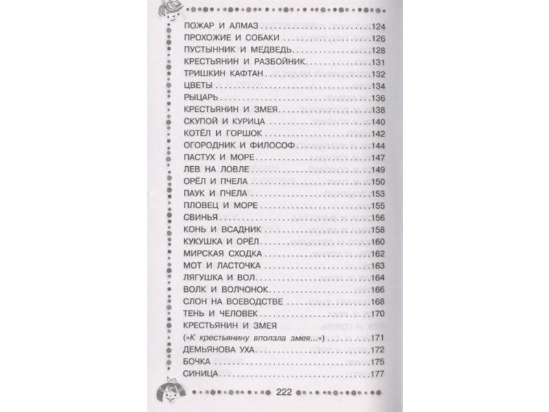 Иван Андреевич Крылов (1769—1844) — написал великое множество басен, все они вошли в девять прижизненных сборников автора, и многие были переведены на иностранные языки. Нравоучительные басни И. А. Крылова не узнать невозможно: их отли- чает живость речи, самобытная форма написания и умение остроумно и незатейливо высмеять человеческие пороки и недостатки. Помимо известных басен ("Стрекоза и Муравей", "Слон и Моська", "Мартышка и очки", "Лебедь, Щука и Рак") в книгу вошло много других, которые не только познакомят ребёнка с народной мудростью, но и расскажут, почему иногда говорят "а воз и ныне там", "слона-то я и не приметил", "а ларчик просто открывался". Уже более ста лет произведения И. А. Крылова остаются классикой рус- ской литературы. Для среднего школьного возраста.