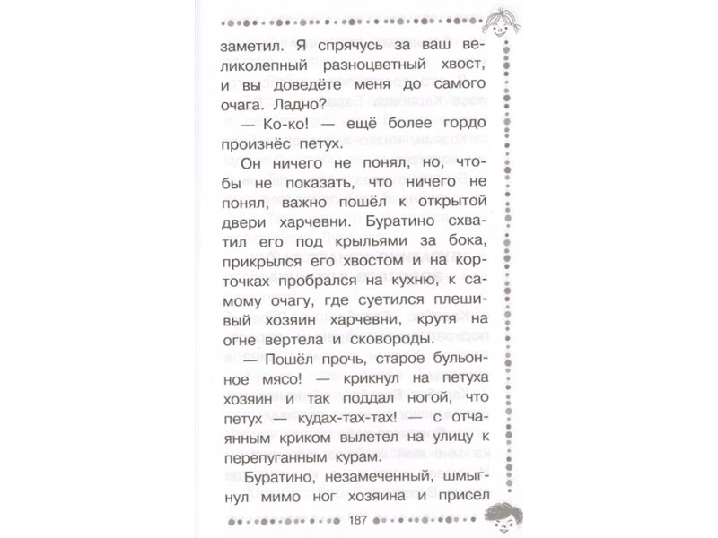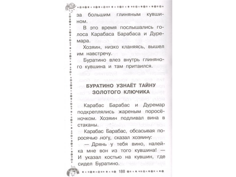 "Золотой ключик, или приключения Буратино" — сказочная повесть А. Н. Толстого о приключениях озорного деревянного мальчишки Буратино. Она была написана в 1935 году и является переложением сказки Карло Коллоди "Пиноккио, или Похождения деревянной куклы". Увлёкшись созданием "Буратино" А. Н. Толстой отошёл от оригинального сюжета и придумал свою историю золотого ключика и нарисованного очага. Буратино зажил своей жизнью и полюбился читателям. Сказочная повесть "Золотой ключик, или приключения Буратино" была переведена на множество языков, издана миллионными тиражами и пользуется огромной популярностью по сей день. В нашу книжку вошли классические иллюстрации знаменитого художника Л. В. Владимирского, создавшего наиболее яркий и запоминающийся образ деревянной куклы Буратино. Для дошкольного возраста.