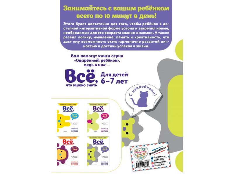 Основная задача книги "Всё, что нужно знать: для детей 6-7 лет" от издательства Эксмо— закрепить и развить навыки ребёнка в процессе игры. Он будет выполнять интересные интерактивные задания — пролетит по облакам на разном воздушном транспорте, украсит листьями осеннее дерево, воспользуется наклейками, чтобы помочь фермеру собрать урожай.