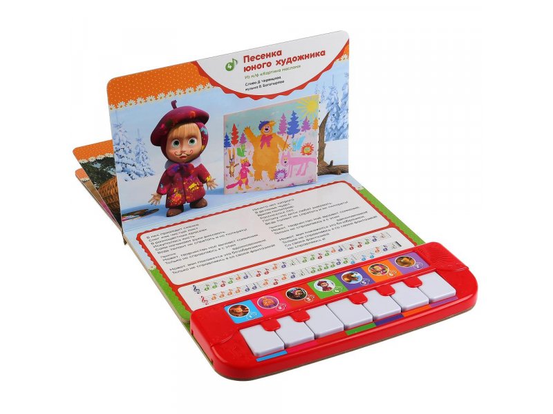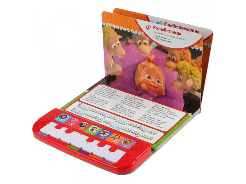 Книга музыкальная Умка, Маша и Медведь, 7 Лучших Песен Маши станет отличным подарком для вашего малыша: съёмное пианино с 7 клавишами (можно играть отдельно); 7 песенок из м/ф: «С днём рождения», «Колыбельная», «Про варенье», «Песенка юного художника», «Про следы», «О чистоте», «Песенка-икалка»; тексты песен- ноты; красочные иллюстрации; любимые персонажи; кнопка Вкл./Выкл. На каждой страничке крупные красивые иллюстрации с текстами песен и нотами к ним. Малыш будет играть на пианино, рассматривать яркие страницы, слушать песни, подпевать и даже танцевать. Одно нажатие на кнопку – песенка включится, второе нажатие – выключится. Пианино можно снять и играть с ним отдельно. Музыкальная книга-пианино ТМ «УМка» развивает: слуховое восприятие и музыкальный слух; навык чтения; фантазию; образное мышление; память.