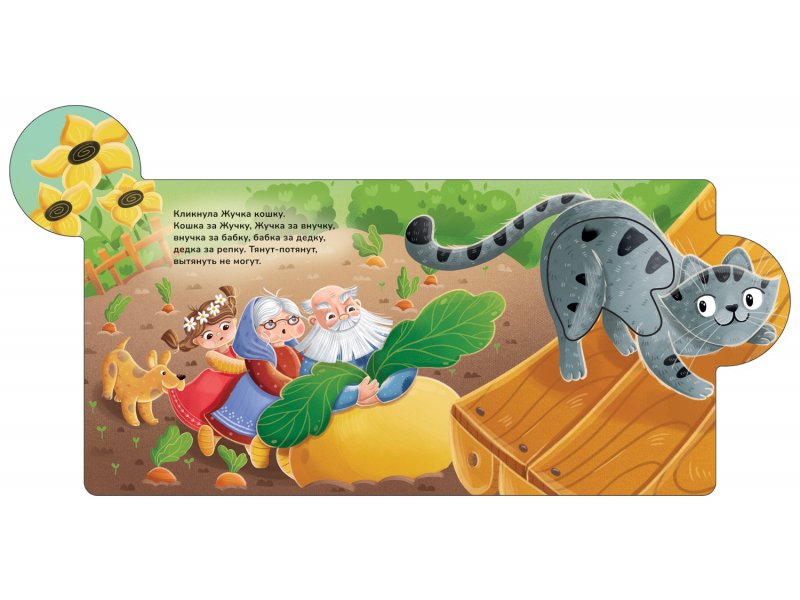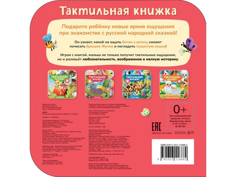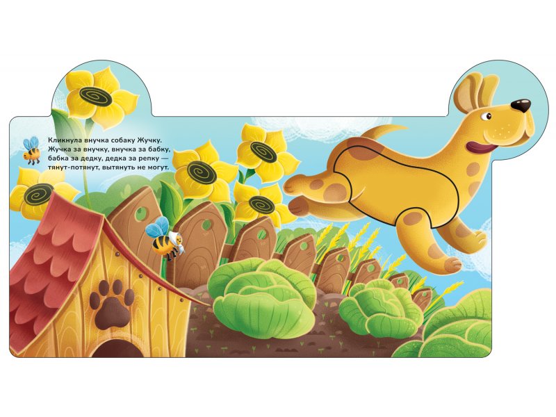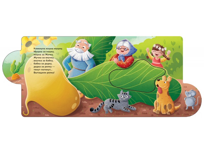 Подарите ребёнку новые яркие ощущения при знакомстве с русской народной сказкой!Он узнает, какой на ощупь бочок у репки, сможет почесать брюшко Жучки и погладить пушистую кошку! Играя с книгой, малыш не только получит тактильные ощущения, но и разовьёт любознательность, воображение и мелкую моторику.