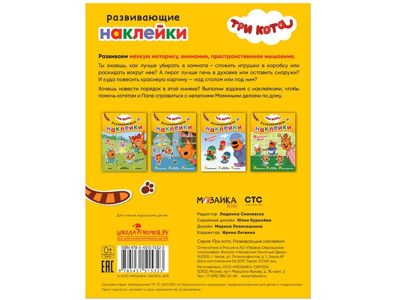 Распределяя яркие наклейки по страницам, он поможет котятам и Папе справиться с Мамиными делами по дому, развить пространственное мышление, внимание и мелкую моторику. Благодаря удобному формату заниматься по книге «Помогаем маме» из серии «Три кота. Развивающие наклейки» можно где угодно: дома, в поездке, гостях и на прогулке.