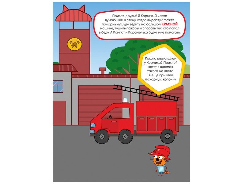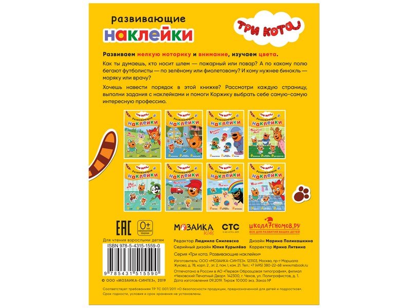 Распределяя яркие наклейки по страницам, он закрепит представления о цветах, сможет развить мышление, внимание и мелкую моторику. Благодаря удобному формату заниматься по книге «Профессии» из серии «Три кота. Развивающие наклейки» можно где угодно: дома, в поездке, гостях и на прогулке.