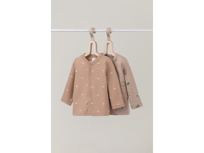 Кофточки в упаковке в количестве 2 штуки для новорожденных из мягкого, эластичного трикотажа, произведенного из натурального хлопка. Изделие застегивается на кнопки. Оригинальная набивка выполнена из стойких, гипоаллергенных текстильных красителей. Все трикотажные полотна производятся в соответсвии с нормами Швейцарского сертификата ЭкоТекс.