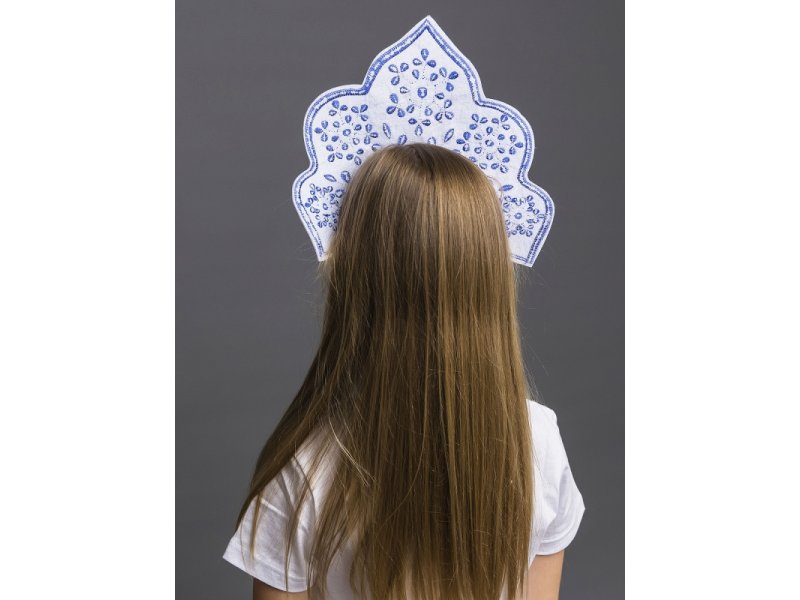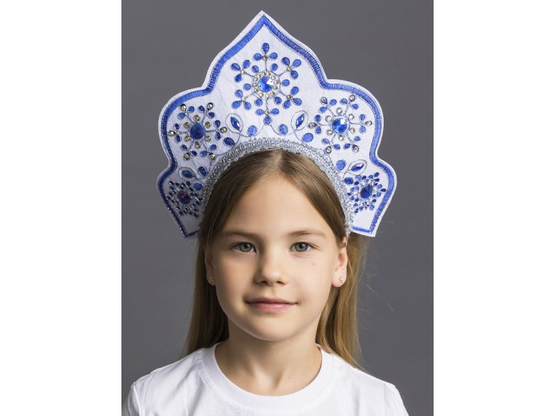 Этот русский народный головной убор отлично поднимает настроение и заряжает им всех окружающих. Чтобы выбрать качественный детский кокошник, который будет отлично смотреться и удобно сидеть на голове, обратитесь к бренду Пуговка. Кокошник Снегурочка детский - один из самых красивых в нашей коллекции карнавальных аксессуаров. Идеально подойдет для создания образа Снегурочки. Особенности: Основной цвет белый с синей вышивкой Вышивка в виде снежинок С вшитыми синими камнями По линии головы окантовка серебряной тесьмой Удобная головная резинка