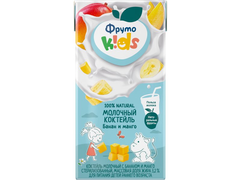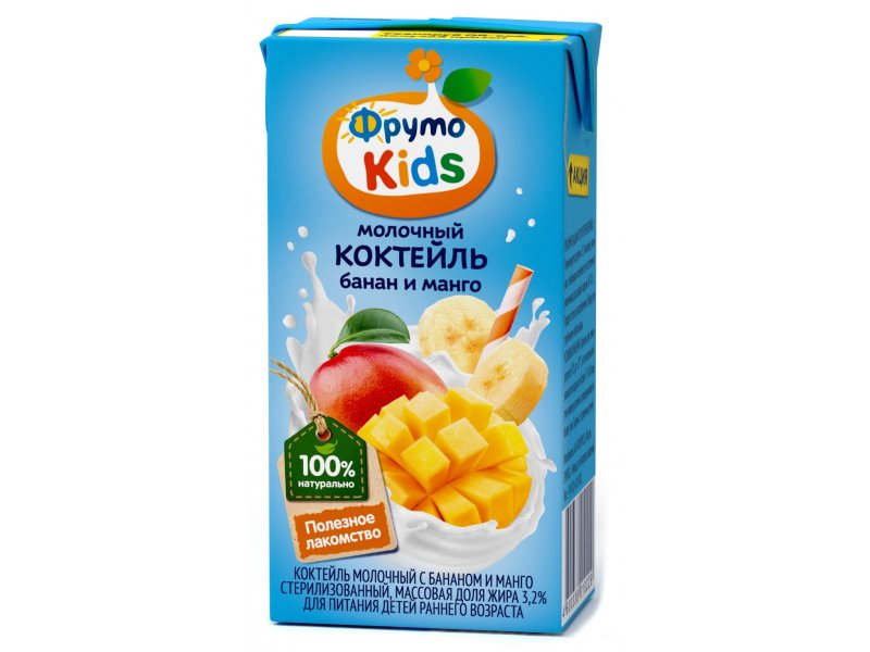 Детский молочный коктейль ФрутоKids - сделан из натурального молока с добавлением фруктовых пюре, которые дополнят рацион Вашего ребенка питательными веществами, необходимыми для гармоничного роста и развития. А экзотические фрукты Манго и Банан разнообразят ежедневный рацион и познакомят с новыми вкусами!