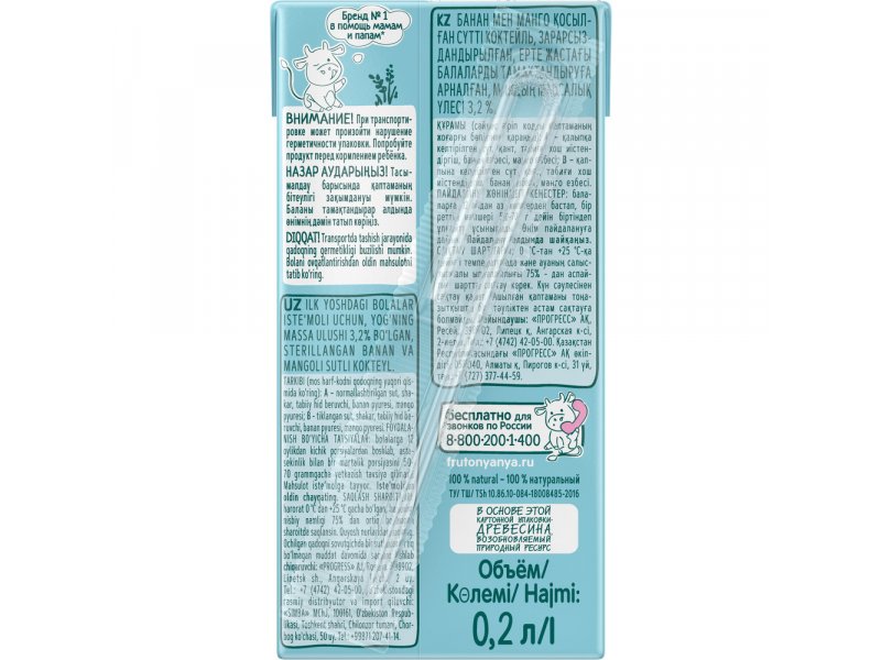 Состав: молоко нормализованное, сахар, пюре банановое, пюре манго, ароматизатор натуральный.
